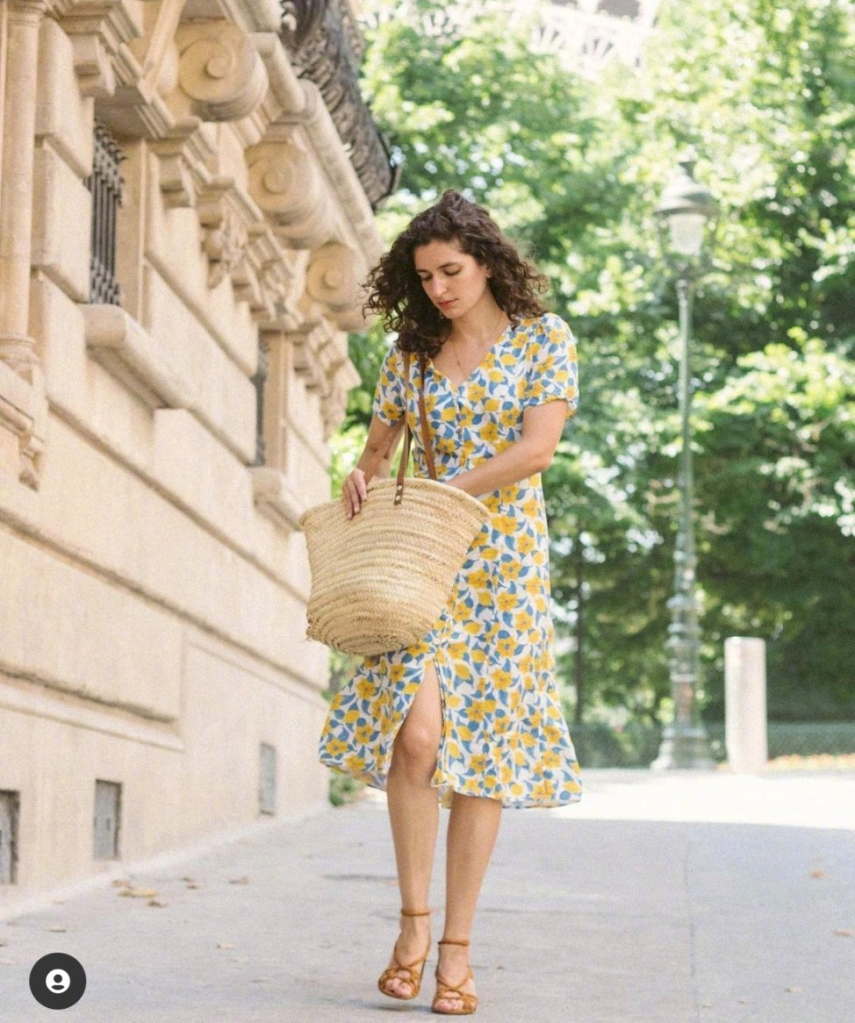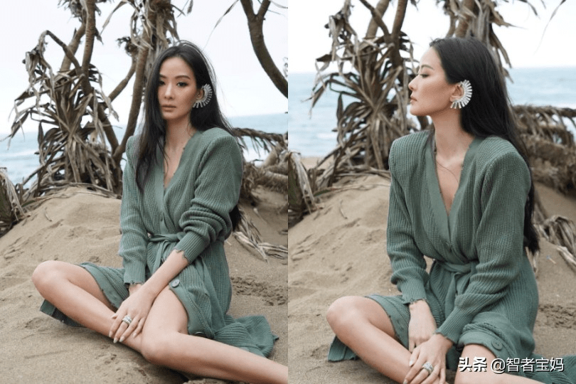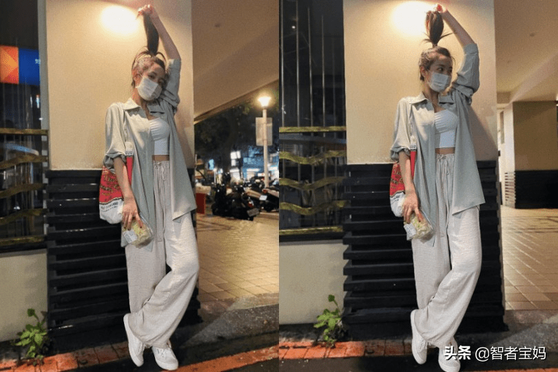 一件米色長款襯衫,內搭性感小黑裙,腳踩涼拖鞋,手拿竹編包,非常休閒風情的穿搭,依然不失應有的利落派頭。