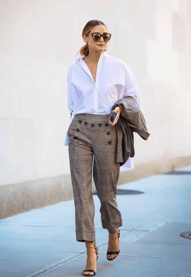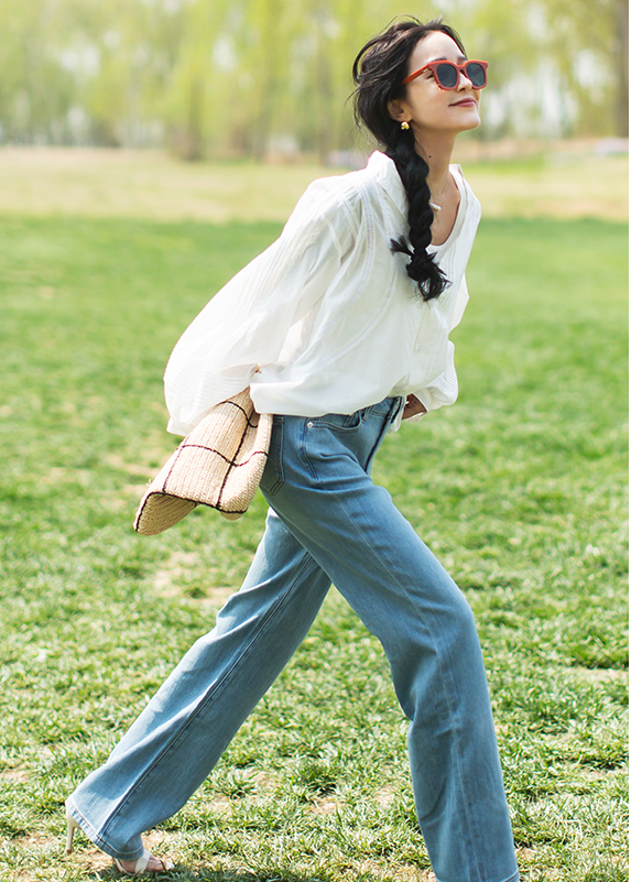 白襯衫搭配白色牛仔褲,休閒與利落兼具。至少有90%的干練氣勢,腳下的小香風高跟鞋就是餘留的10%女人味。