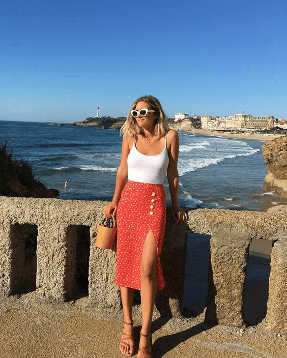 下圖中,同樣的波點半裙,深灰T恤的休閒與紅色針織上衣的女人味截然不同。但幸好,鞋子、包包的不同風格加持,平衡著整體。